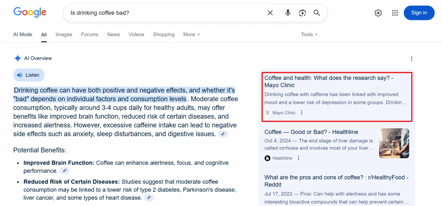 Today, if you ask Google, “Is drinking coffee bad?”, you’ll often see a quick, summarized answer — even before any website links. One common source for this is Mayo Clinic, known for clear and medically reviewed content.