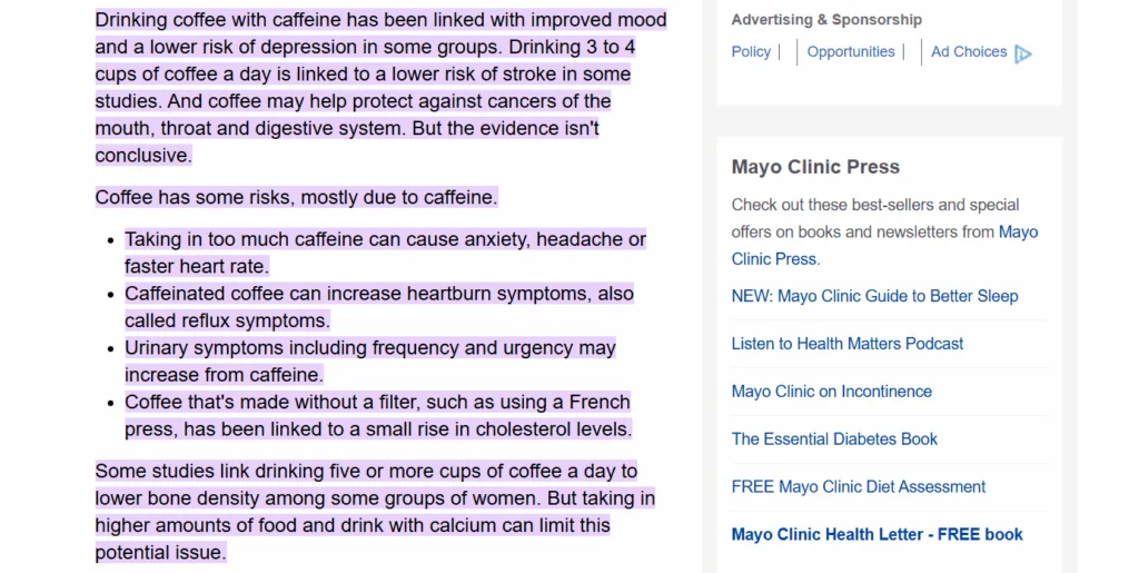 Mayo Clinic is often featured in Google’s AI Overviews or answer boxes for health-related queries like “Is drinking coffee bad?” — even though they may not have specifically optimized for AEO.